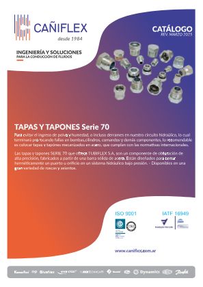 Las tapas y tapones SERIE 70 que ofrece TUBIFLEX S.A, son un componente de obturación de alta precisión, fabricados a partir de una barra sólida de acero. Están diseñados para cerrar herméticamente un puerto u orificio en un sistema hidráulico bajo presión. - Disponibles en una gran variedad de roscas y asientos.