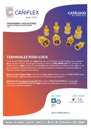 Los terminales PUSH-LOCK, son conexiones para ser utilizados en baja presión, con un sistema propio de autosujeción, aplican generalmente en líneas de AIRE, AGUA y ACEITE. En líneas de mantenimiento, robótica y circuitos de refrigeración, la velocidad lo es todo, por tal motivo el uso de abrazaderas a tornillo tradicionales, consumen tiempo de instalación y a menudo provocan fallas por apriete irregular de las mismas.